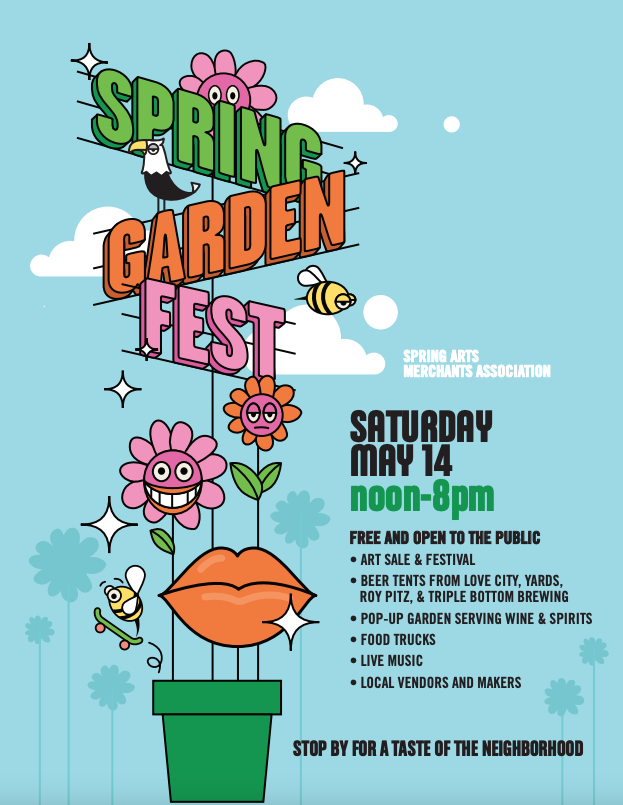 The Spring Arts Merchants Association’s 1st annual festival known as the, Spring Garden Party, will take place in the Spring Arts district in Callowhill. The Main Event will be Saturday, May14 from Noon-8pm.